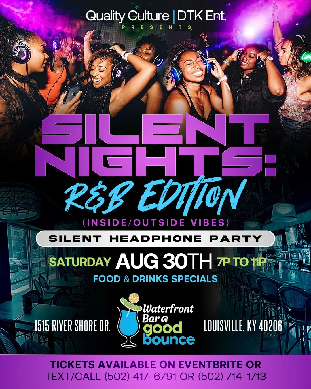 Join us Saturday, Aug 30th as Quality Culture 502 presents R&B Only: The Silent Night Edition at Good Bounce in Louisville, KY. This event is from 7-11pm and features music by DJ John Q, DJ Empty Beats, DJ Slikk, & DJ Mightily . This is a strictly 30 & over event for the mature & sophisticated socialite.